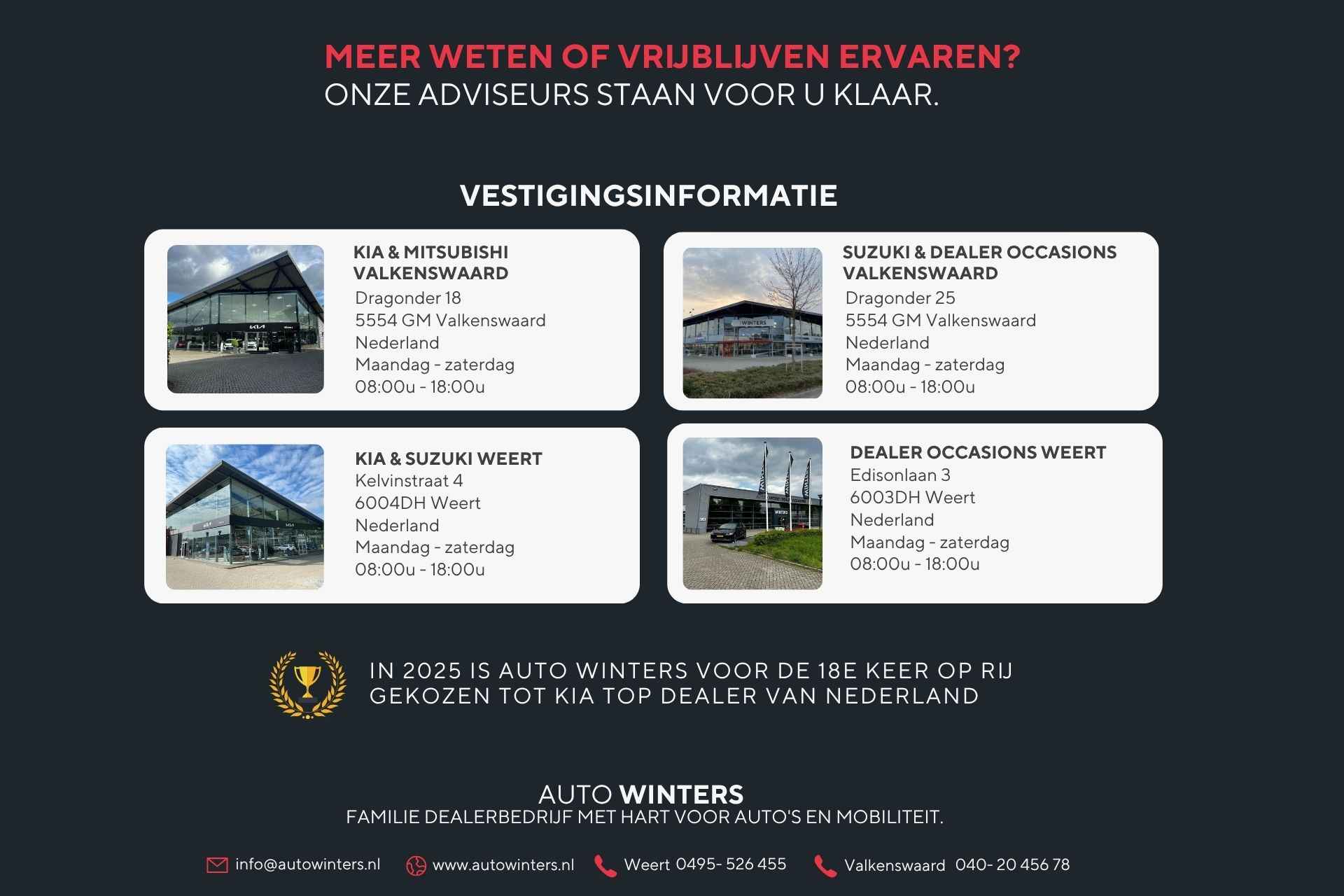 Auto Winters is erkend dealer van Kia, Mitsubishi en Suzuki. Tevens hebben wij altijd een zeer ruim aanbod occasions van alle merken op voorraad staan.
